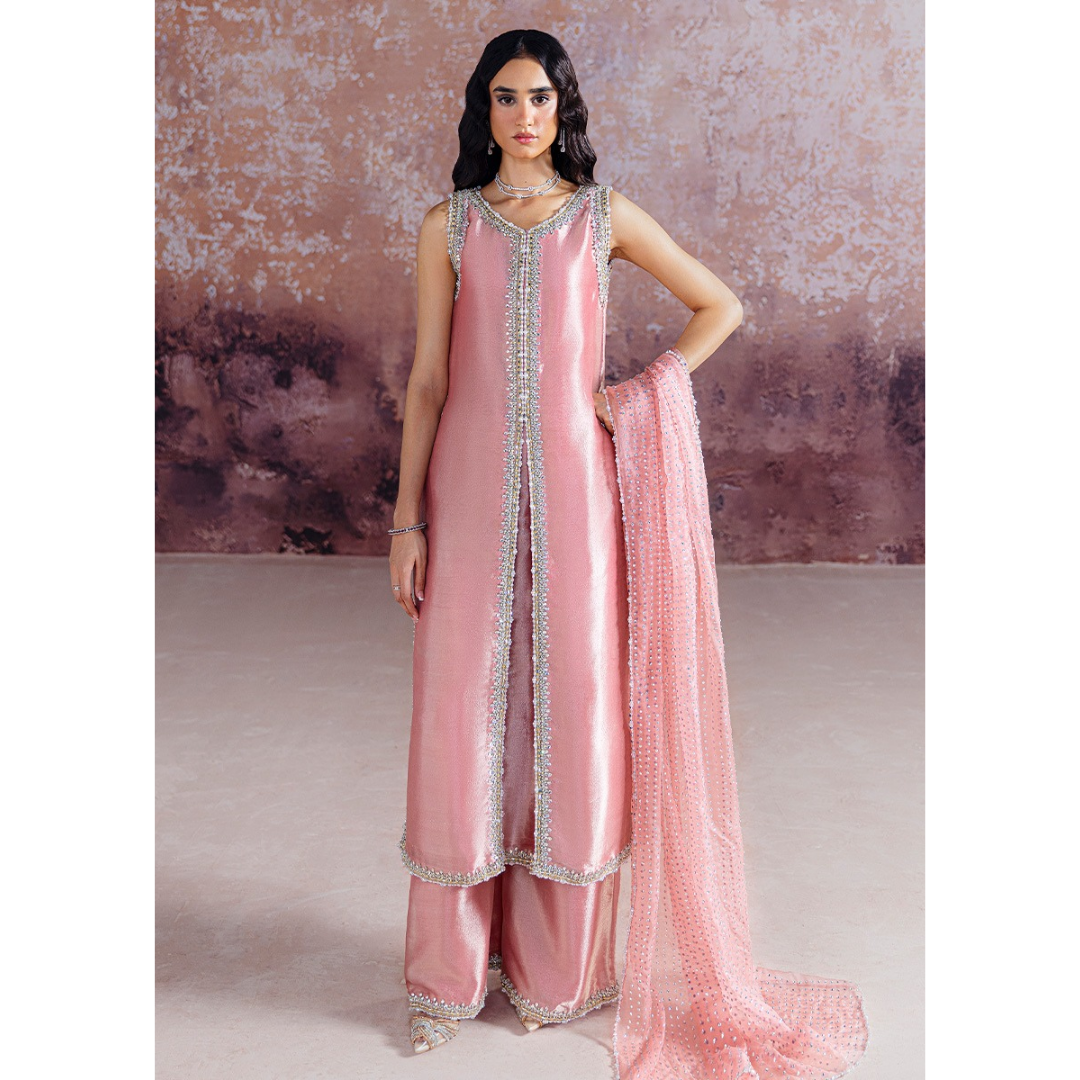 Ayda is a radiant dialogue between heritage and modernity. The silhouette unfolds in gleaming tissue,with a front-open cut, traced with intricate handwork that runs along the sides and armholes, lending a sculptural sharpness to its fluid form. A sheer tissue dupatta drifts effortlessly with its surface scattered with crsytals that sparkles like stardust dissolving into a pale horizon. Flowing beneath the wide flared tissue pants descend into a refined border, their subtle gleam lending structure and refinement to the ensemble’s airy grace.
