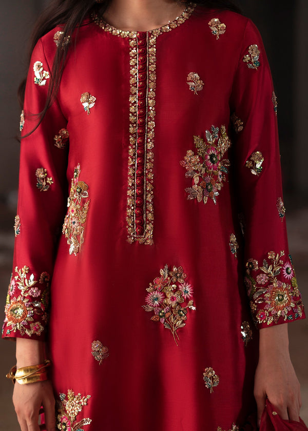 This deep red ensemble radiates timeless elegance with its rich color and intricate embellishments. The long shirt features hand-embellished floral motifs and detailed work along the neckline and cuffs, paired with straight trousers and a flowy organza dupatta. A bold yet classic choice for festive evenings or formal gatherings.